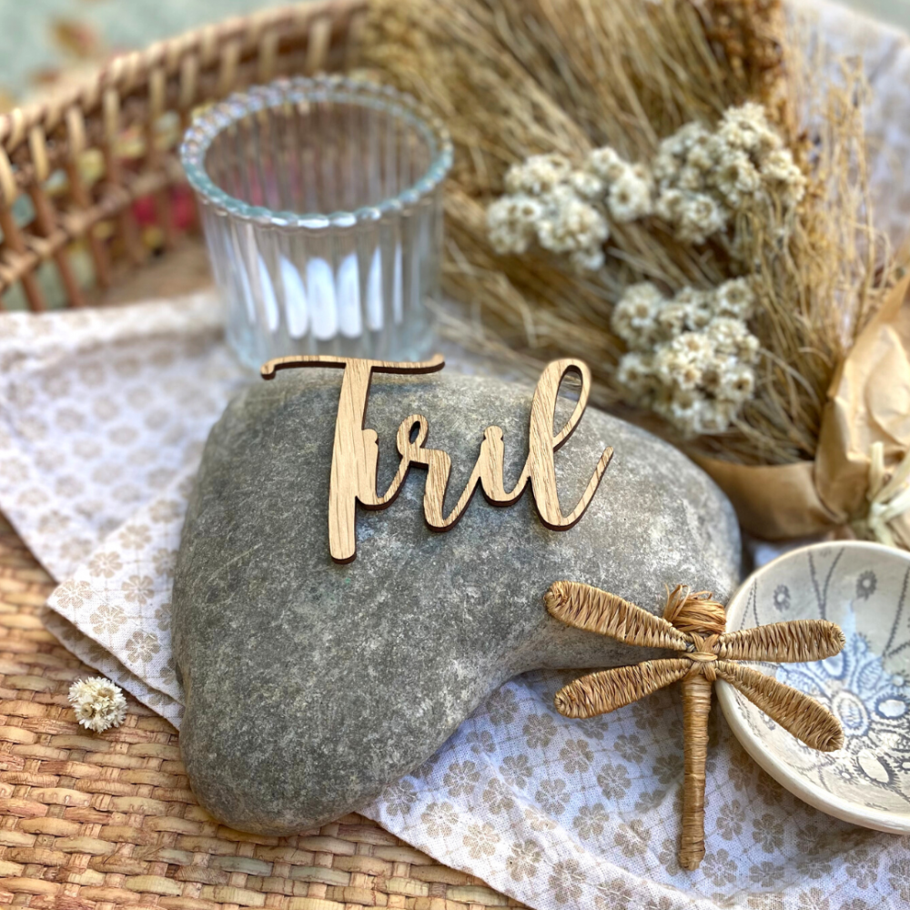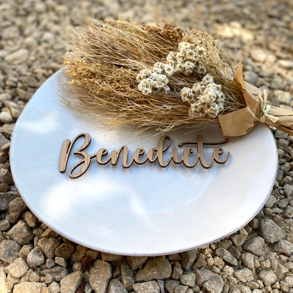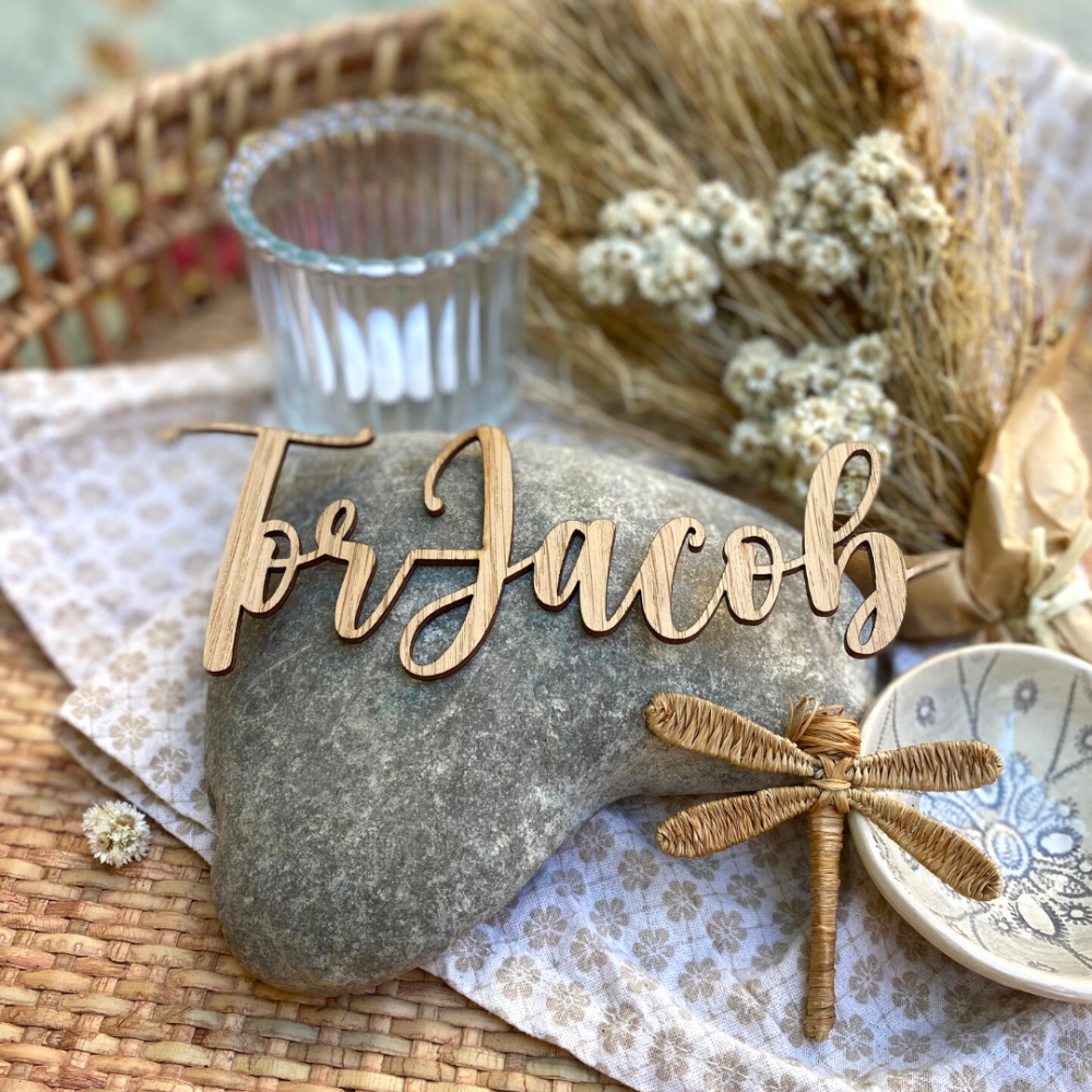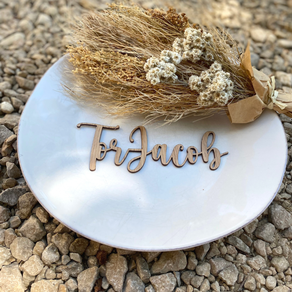 Bordkort i trefinér med løkkeskrift. Kjempefine laserutskjært bordkort til dåp, bursdag, konfirmasjon eller bryllup. Det er også en flott overraskelse til gjestene som de kan ta med seg hjem.