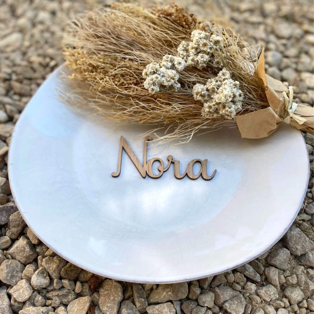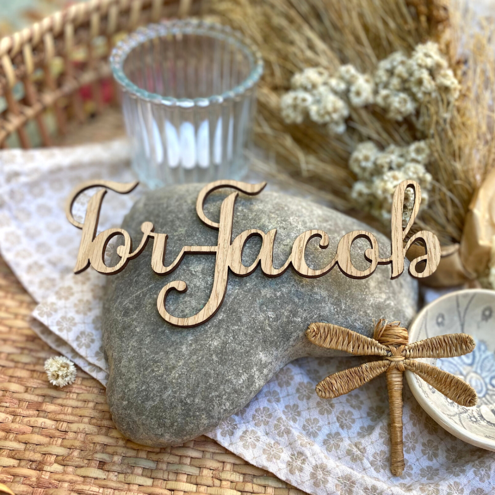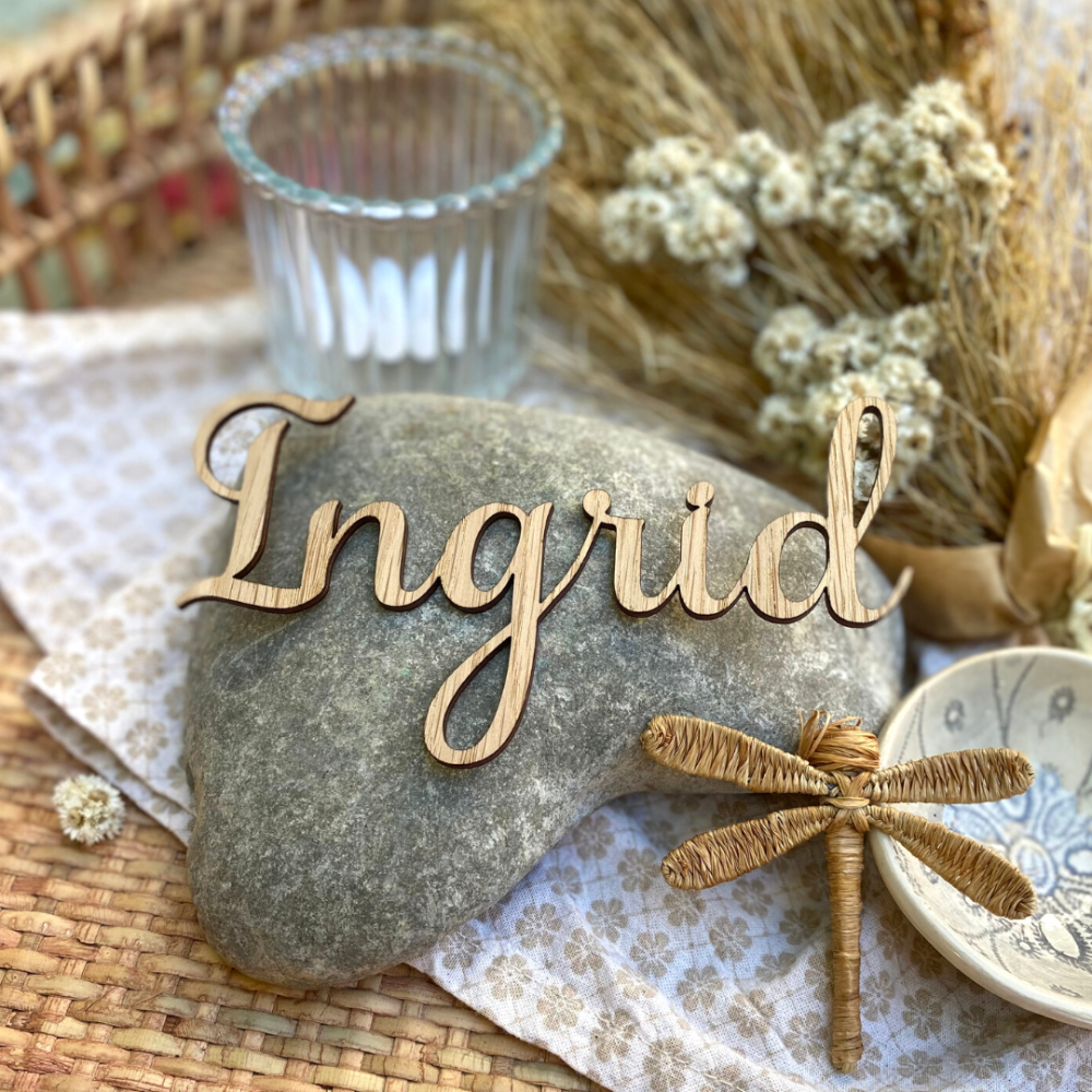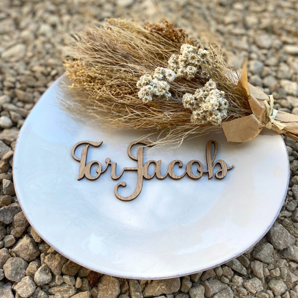 Bordkort i trefinér med retropreg. Kjempefine laserutskjært bordkort til dåp, bursdag, konfirmasjon eller bryllup. Det er også en flott overraskelse til gjestene som de kan ta med seg hjem.