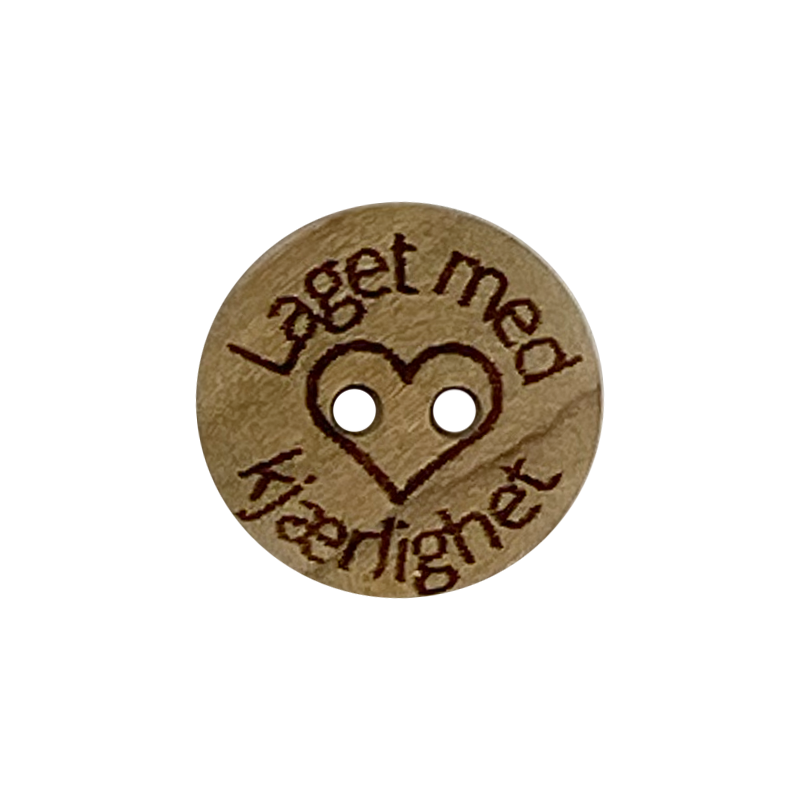Ttreknapp med teksten Laget med kjærlighet og et hjerte i midten.