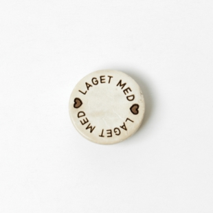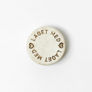 Kokosknapp med teksten Håndlaget. Kan vaskes på 40 grader.