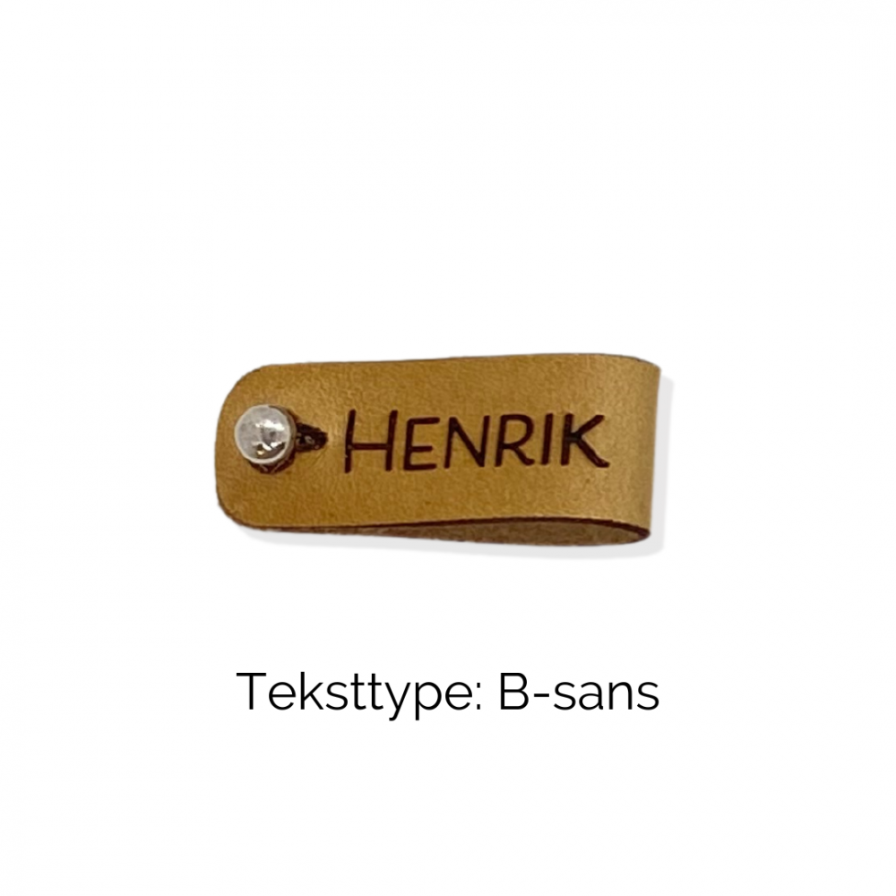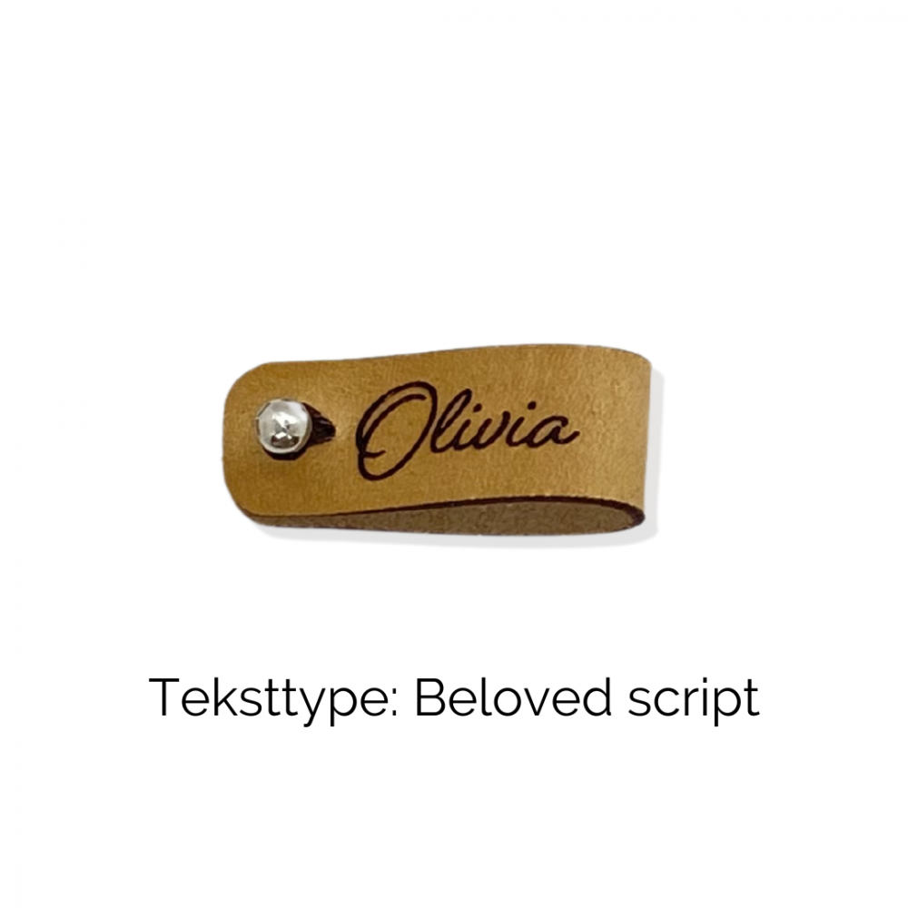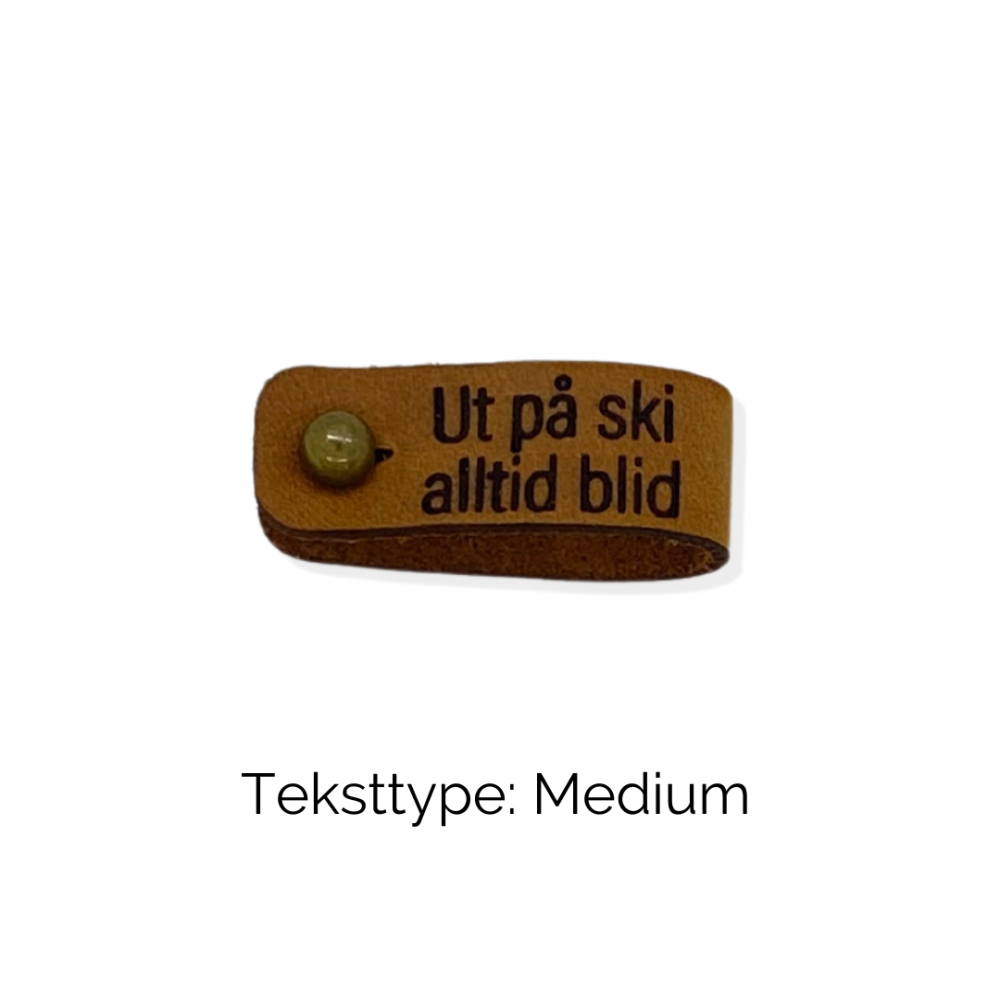 Merke i skinn med valgfri tekst. Kan brukes til å brette over vrangbord/kant. Knapp til å lukke/feste, dette gjør det enkelt å ta av ved vask, flytte eller ha på annet plagg etter behov. Du kan også velge hvilken farge du vil ha på lukkemekanismen. Sølv eller Messing.