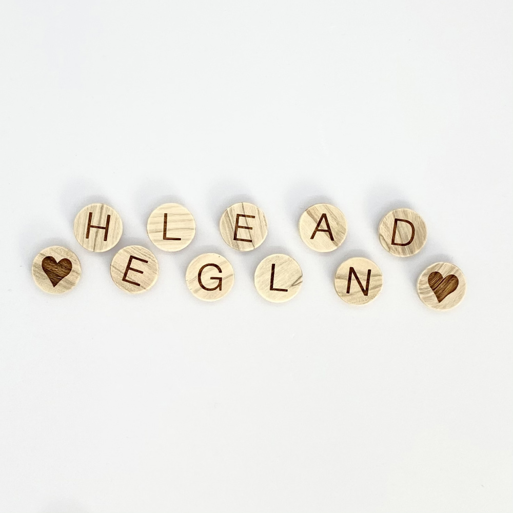 11 knapper med 1 bokstav på hver knapp + 2 knapper med 1 hjerte på hver.