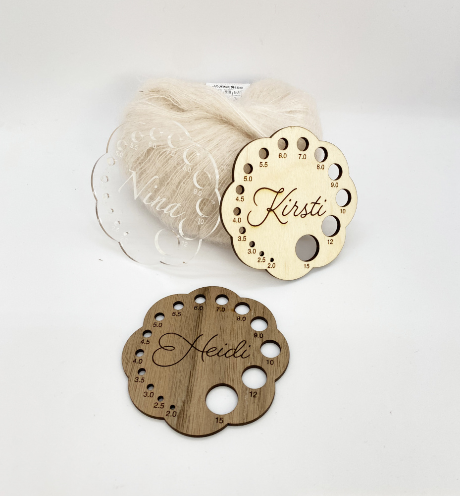 Her på Nøstenett produserer vi egne produkter som strikkefasthetsmålere, sokkeblokkere, høydemåler m.m. Vi graverer også skinnlapper og knapper med ønsket tekst/logo.