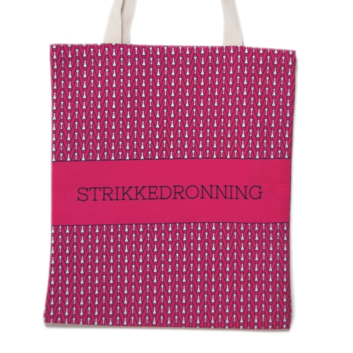 Veske i stoff med teksten "Strikkedronning"