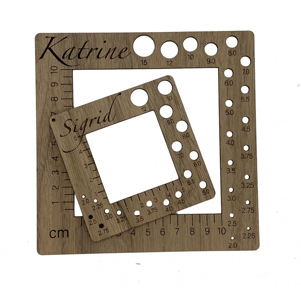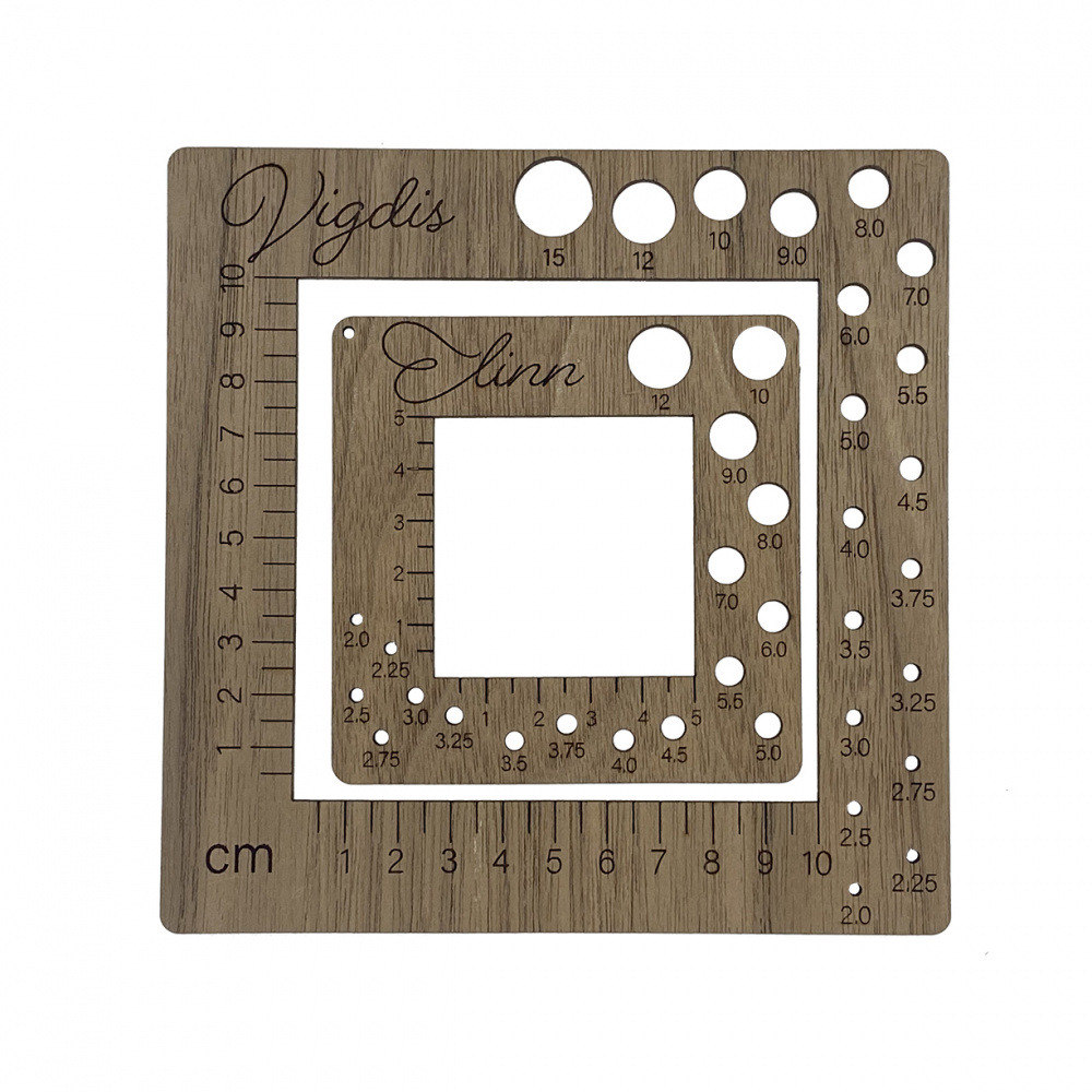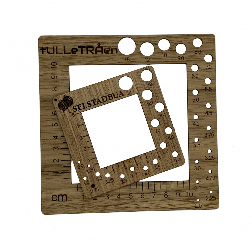 Kjempefin strikkefasthetsmåler med hull for å måle pinnestørrelser.