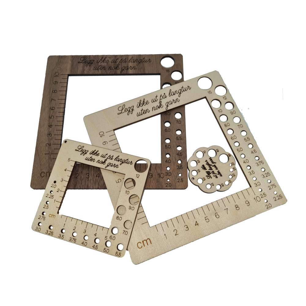 Her på Nøstenett produserer vi egne produkter som strikkefasthetsmålere, sokkeblokkere, høydemåler m.m. Vi graverer også skinnlapper og knapper med ønsket tekst/logo.