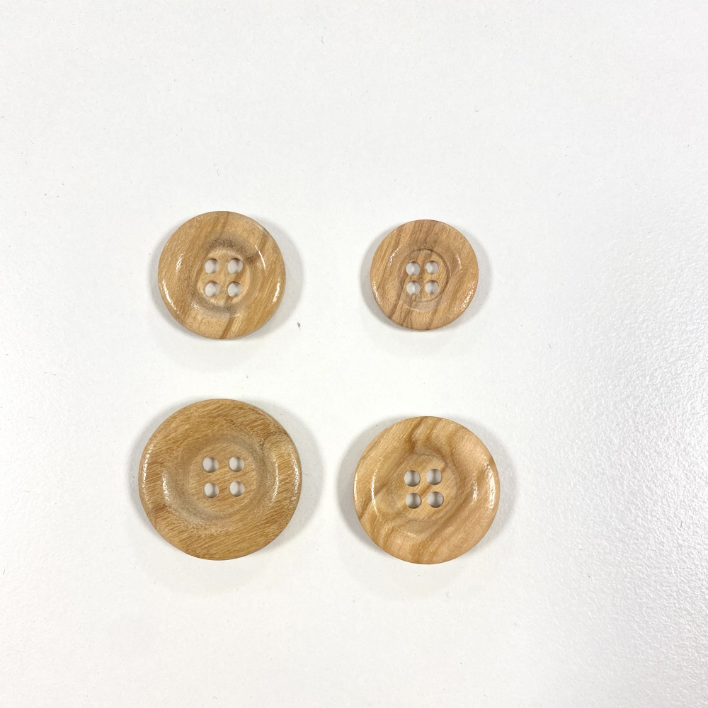 Rund treknapp i oliventre med fire hull.