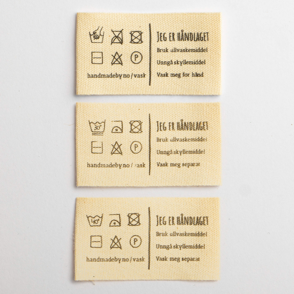 vaskelappene finnes i tre varianter og passer til de fleste håndlagde plagg. De kan sys inn med maskin eller for hånd i plagg som er både strikket, heklet og sydd.